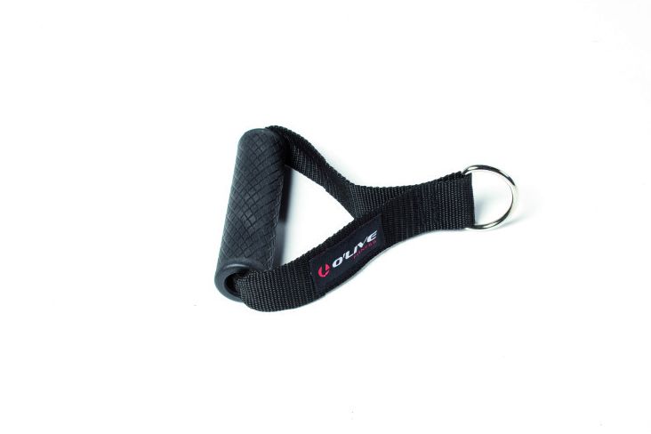 La poignée simple O'Live est faite de nylon et de ruban plastique et est utile lorsqu'elle est utilisée avec des machines à câble à poulie.